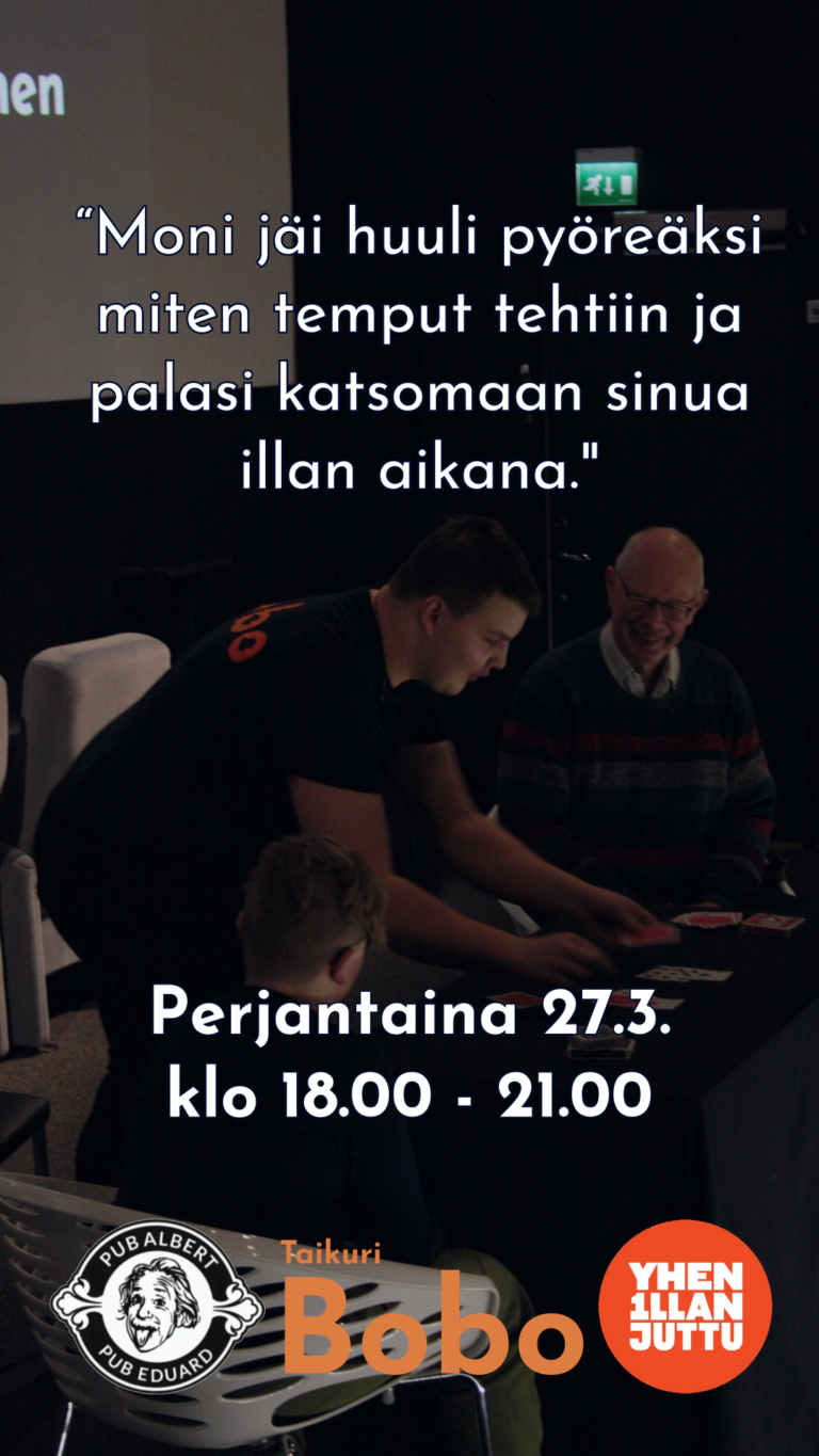 27.3. klo 18-21 Taikuri Bobo kiertelee pöytiä Kotkan Pub Albertissa sekä Pub Eduardissa.